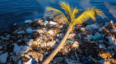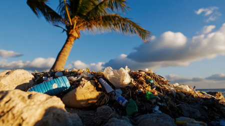 Palm tree surrounded by discarded plastic bottles and bags on a tropical coastline