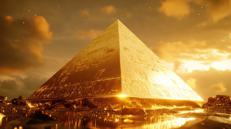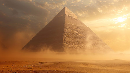 hazy, atmospheric shot of a pyramid at sunrise, created with generative ai