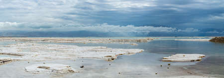 Panorama photo of lowest salty lake in world Dead sea, full of minerals near luxury vacation resort Ein Bokek, place for medical treatments, climatotherapy, thalassotherapy and heliotherapy.