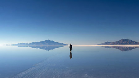 Person stands on expansive salt flat, surrounded by serene mountains and clear blue sky, evoking feelings of tranquility and solitude in nature beauty, AI generated