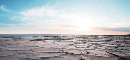 Landscape of a deserted salt lake. The texture of salt formations in the foreground. salt lake surface, dry salt lake, white salt lake