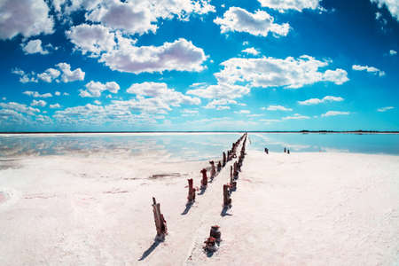 Saline surface and blue sky with clouds. Salt industry on Sasyk-Sivash salt lake in Crimea. Summer landscape