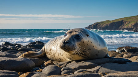 A curious seal rests on rocky shoreline, observing the tranquil ocean waves. The scene captures the serene beauty of marine wildlife in its natural habitat.