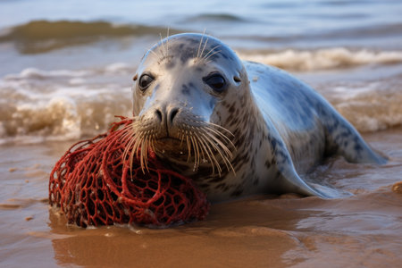 An AI generated illustration of a seal wrapped in plastic on the beach, environmental pollution concept