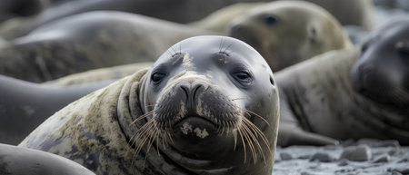 Close-up of brown seal remaining. Wild marine mammal with whiskers and flippers, symbol of wildlife, ocean life and relaxation.