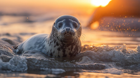 A charming harbor seal relaxes on the beach as gentle waves wash the shore at sunset. The golden light of the setting sun illuminates the scene, creating a peaceful and serene moment. The seal's dark eyes and delicate whiskers are clearly visible in this close-up shot, showcasing the beauty of marine wildlife.