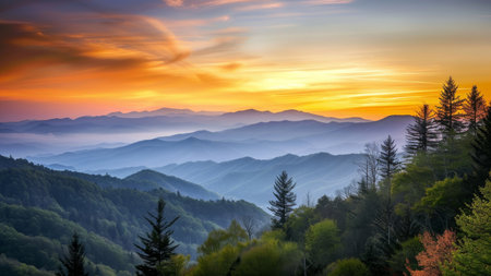 Beautiful Smoky Mountain Sunset Panorama. Sunset from Clingman's dome over the mountain range of the Great Smoky Mountains National Park in Gatlinburg, Tennessee.