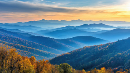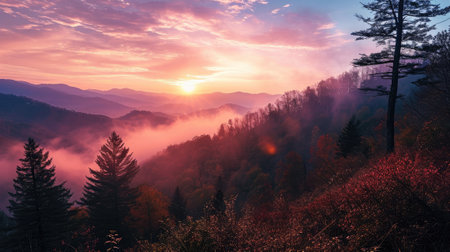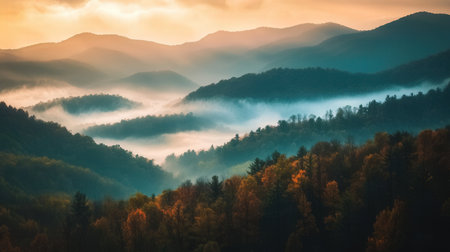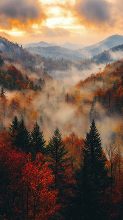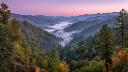 A breathtaking view of a mountain valley at dawn, where soft mist rises among vibrant forests and rolling hills, showcasing the beauty of nature in autumn.