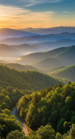 View of a winding road towards the Great Smoky Mountains National Park, Tennessee, with lush green forest and distant peaks