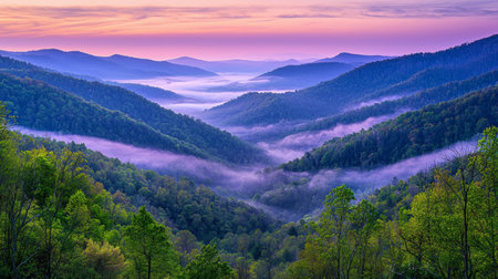 A Breathtaking mountain landscape at dawn with misty valleys and vibrant colors. serene view captures beauty of nature, showcasing lush greenery and rolling hills