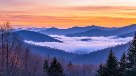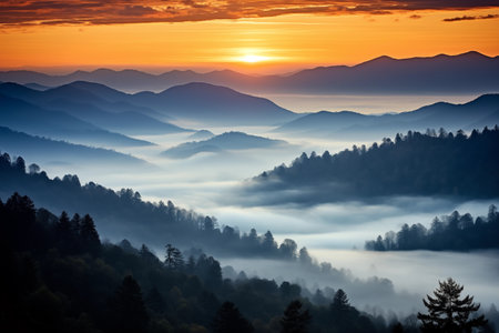Beautiful sunset in the smoky fog mountains. Generative AI.
