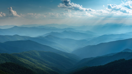 A breathtaking view of layered mountains showcases a tranquil landscape, featuring soft blue hues and lush greenery, illuminated by beautiful rays of sunlight.