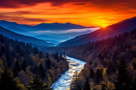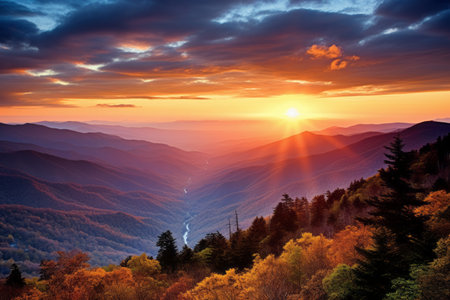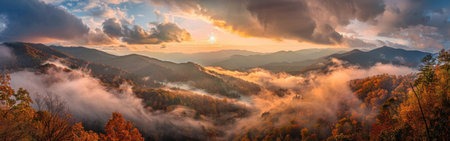 A panoramic view of the Smoky Mountains at sunrise, showcasing a valley blanketed in fog with the sun peeking through clouds. The image captures the vibrant colors of autumn foliage, creating a stunning and tranquil scene.