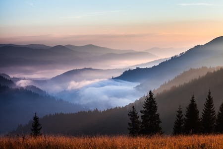 Mountain landscape with forested hills with fog in the valley at sunrise. Breathtaking natural scenery
