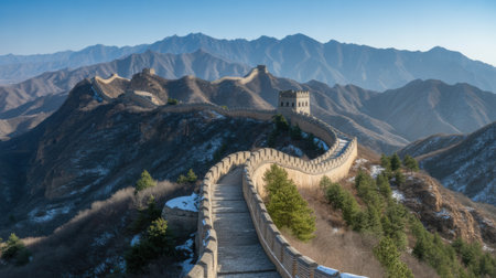The iconic Great Wall of China stretches across the rugged landscape as it winds its way through mountains and valleys, Mesmerizing view of the Great Wall of China, AI Generated