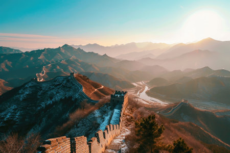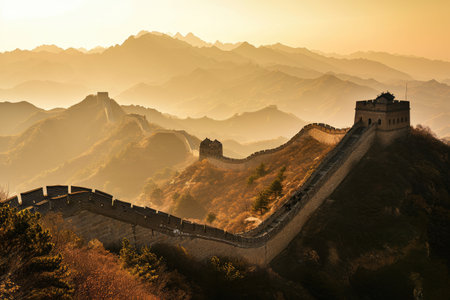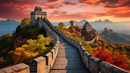 A panoramic view of the Great Wall of China during the golden hour Ai generated