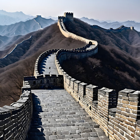 A panoramic documentary-style image capturing the majestic and ancient presence of the Great Wall of China Highlighting its historical and architectural significance with weathered stones watchtowers and scenic landscapes Natural lighting accentuates the walls texture and scale while figures in the distance emphasize its vastness