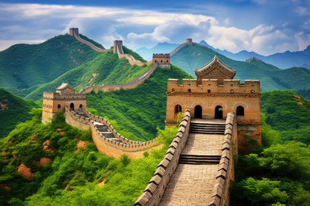 Our image depicts the mystical Great Wall of China, weaving through majestic mountains and forests, offering nearby hotels and apartments for a serene stay