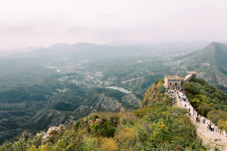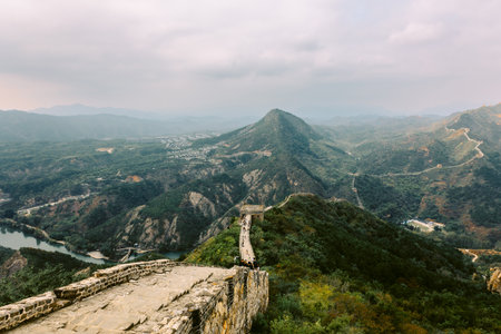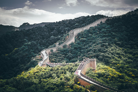 A panoramic view on a renewed Jinshanling part of Great Wall of China. The wall is spreading on tops of mountains. Many watchtowers on the peaks. Dense forest around it. World wonder. Tradition