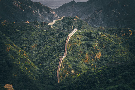 Aerial view of Great Wall of China. Famous landmark Great Wall and mountains located in Hebei province next to Beijing.