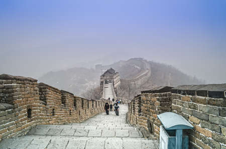Foggy view in winter weather at The Great Wall Mutianyu in Beijing, China.