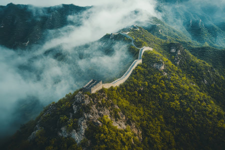 An aerial perspective showcases the Great Wall of China snaking over verdant hills. Fog envelops the landscape, creating a serene and mysterious atmosphere during the early morning.