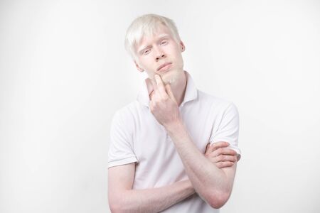portrait of an albino man in studio dressed t-shirt isolated on a white background. abnormal deviations. unusual appearance. skin abnormality