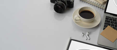 White office photography desk table with laptop, notebook, camera and pen. Top view with copy space. Mock up