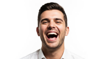 A woman is shown smiling with joy, dressed in casual attire. The image highlights a bright indoor setting, illuminated by natural light. The composition features a clean background with the subject as the central focus. Suitable for diverse commercial and editorial applications, emphasizing positive emotions and lifestyle themes.