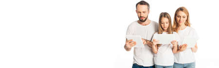 family in white t-shirts using digital tablets isolated on white, panoramic shot