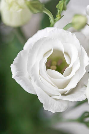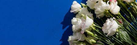Moody Floral background with White flowers Eustoma or Lisianthus on blue background with copy space, floral design, selected focus.