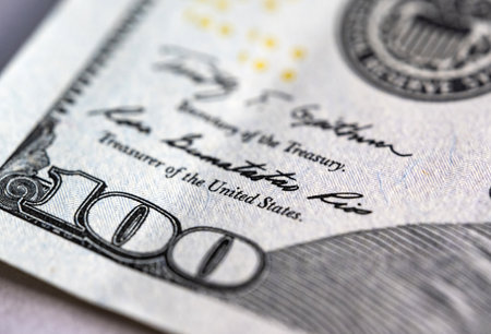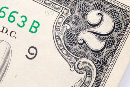 Close up macro view of one hundred American dollars bill. United States currency. Close up fragment of 100 dollars bill.