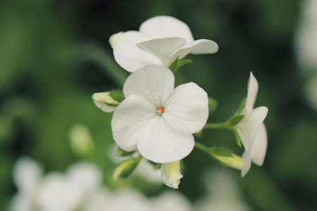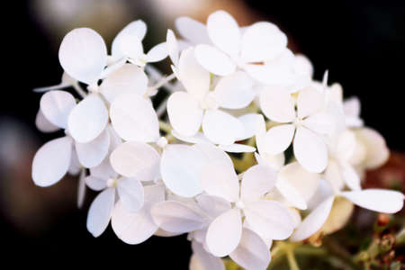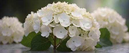 AI Generated. White hydrangea blossom on magical bokeh background with copy space for text placement