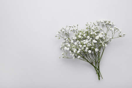 Beautiful bouquet of white gypsophila flowers on light gray background, top view. Space for text