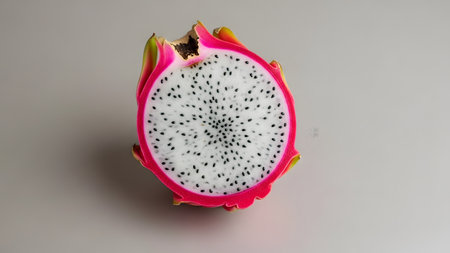 A fresh dragon fruit (pitaya) cut in half, displaying its white flesh and black seeds against a neutral gray background. The vibrant pink skin adds a pop of color to the minimalist composition.