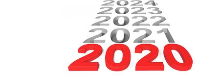 white 2020 numbers near Christmas baubles on light blue background, panoramic shot