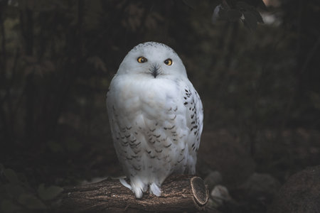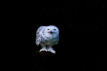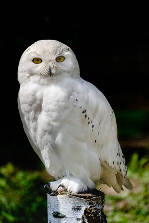 male snowy owl (Bubo scandiacus) sitting on a wooden log and looking at you, with sunlight and dark background