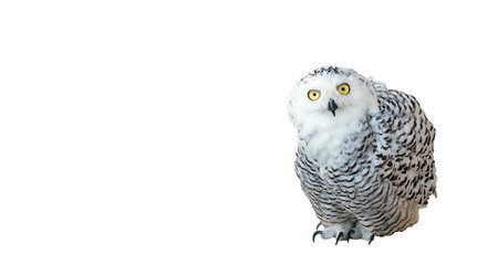 White snowy owl looking at camera isolated on white background. Big nocturnal ruffled bird of prey. Animal close-up. Wildlife animal.