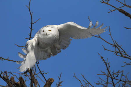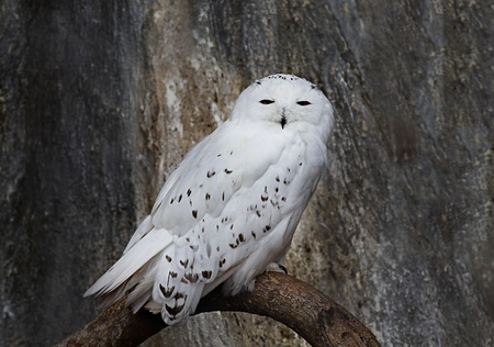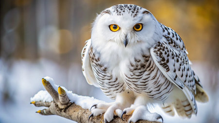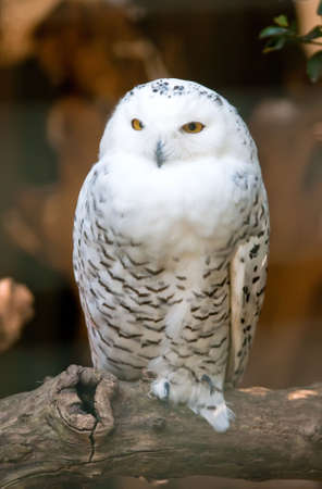 Beautifuk Snowy owl or Bubo scandiacus perches on branch