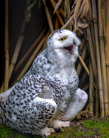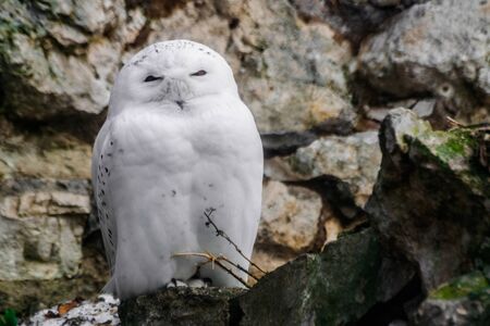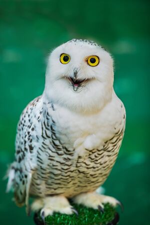 Happy smiling white and wild snowy Owl, yawning with closed eyes in the morning, close up head shot