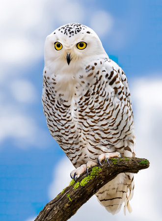 Snowy owl sitting on a branch, daytime sky background. Snowy owl, Bubo scandiacus is a monotypic species of owl from the Strigidae family, in the natural environment.