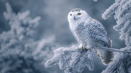 Snowy Owl (Bubo scandiacus) sitting on a pine branch in winter