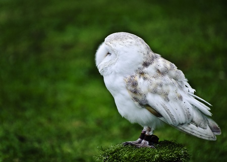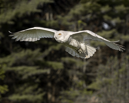 Flying over greens and a dark background. White polar owl in summer, wild beautiful bird of prey.