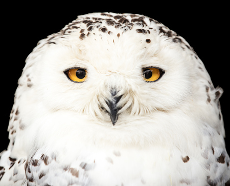 Wise looking white snowy Owl with big orange eyes portrait, black background, close up head shot