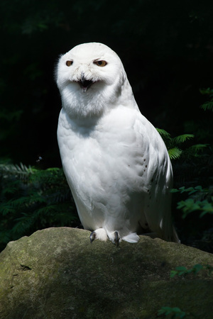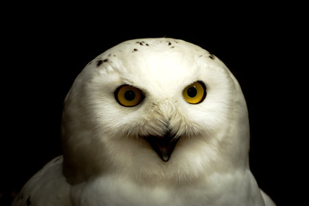 Portrait snowy owl with open beak on the black background. Photo from Czech republic.