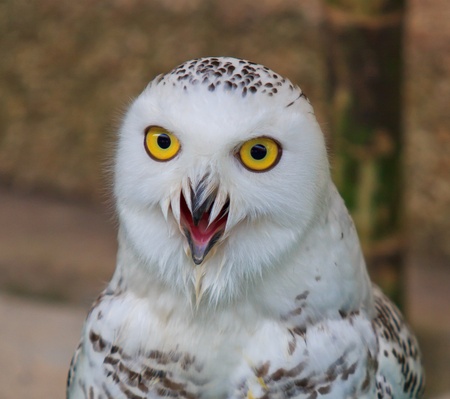 Head shot of a snowy owl with his beak open. He has a bright yellow eye.
