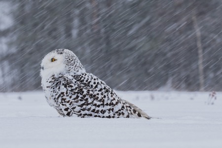 Snowy owl sitting on the snow. Winter scene with snowflakes in wind