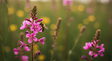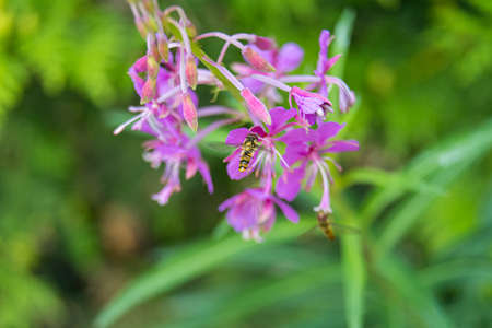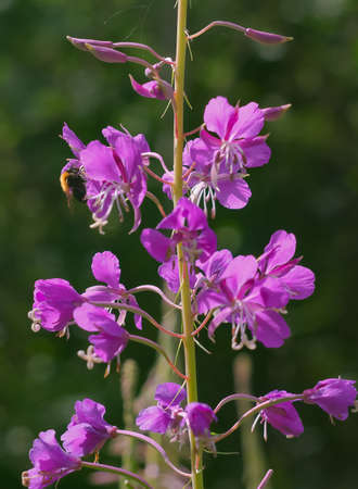 The willow herb Chamerion angustifolium plant blooms and the bee pollinates the flower. Color, beauty.