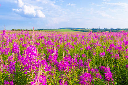 Summer background with pink fireweed or Blooming Sally under cumulus cloudy sky. Purple blossom field of Chamaenerion angustifolium or rosebay willowherb. Blurred foreground