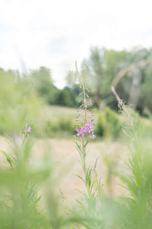 Chamaenerion angustifolium, fireweed, great willowherb flowers in meadow macro selective focus